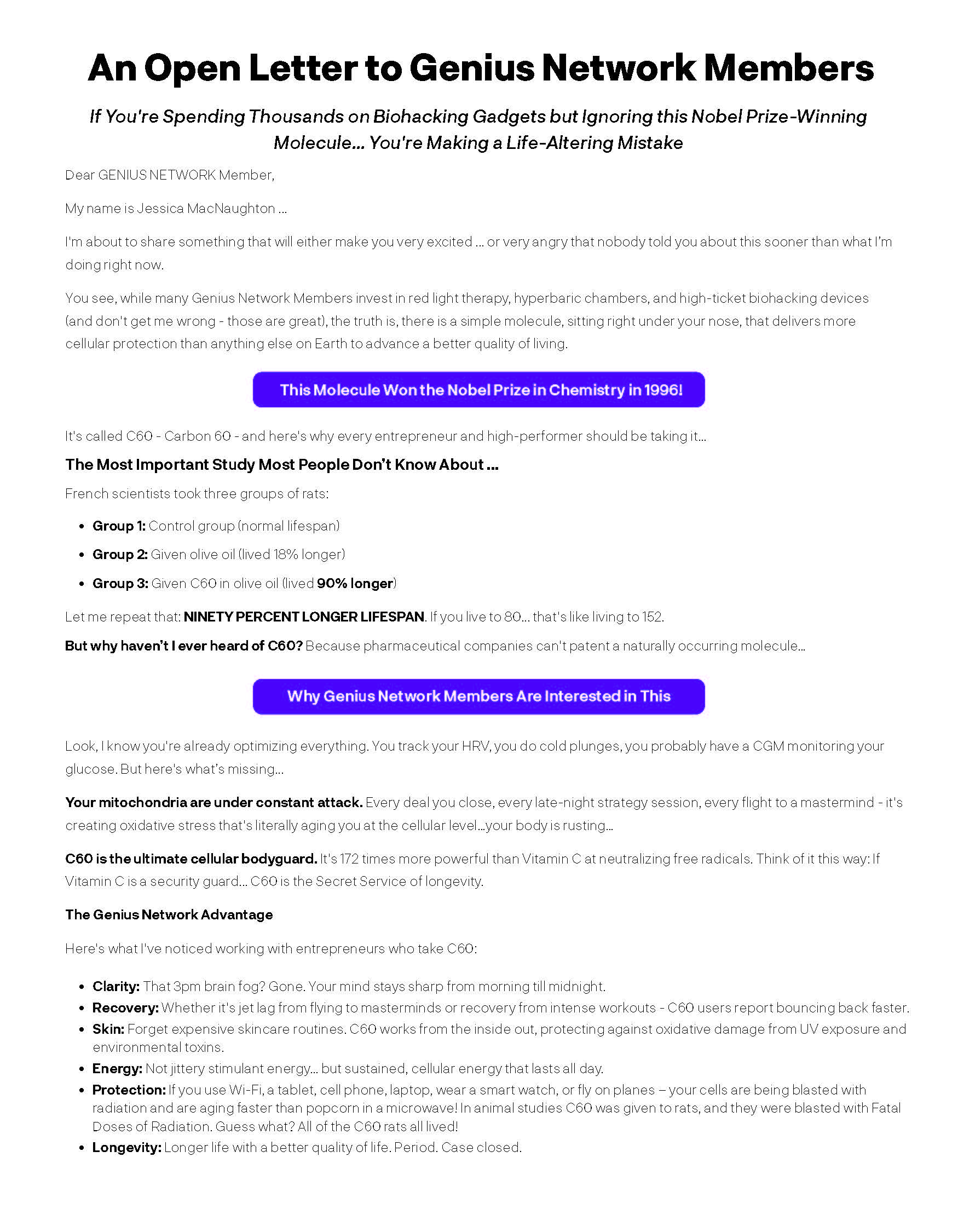 You see, while many Genius Network Members invest in red light therapy, hyperbaric chambers, and high-ticket biohacking devices (and don't get me wrong – those are great), the truth is, there is a simple molecule, sitting right under your nose, that delivers more cellular protection than anything else on Earth to advance a better quality of living.