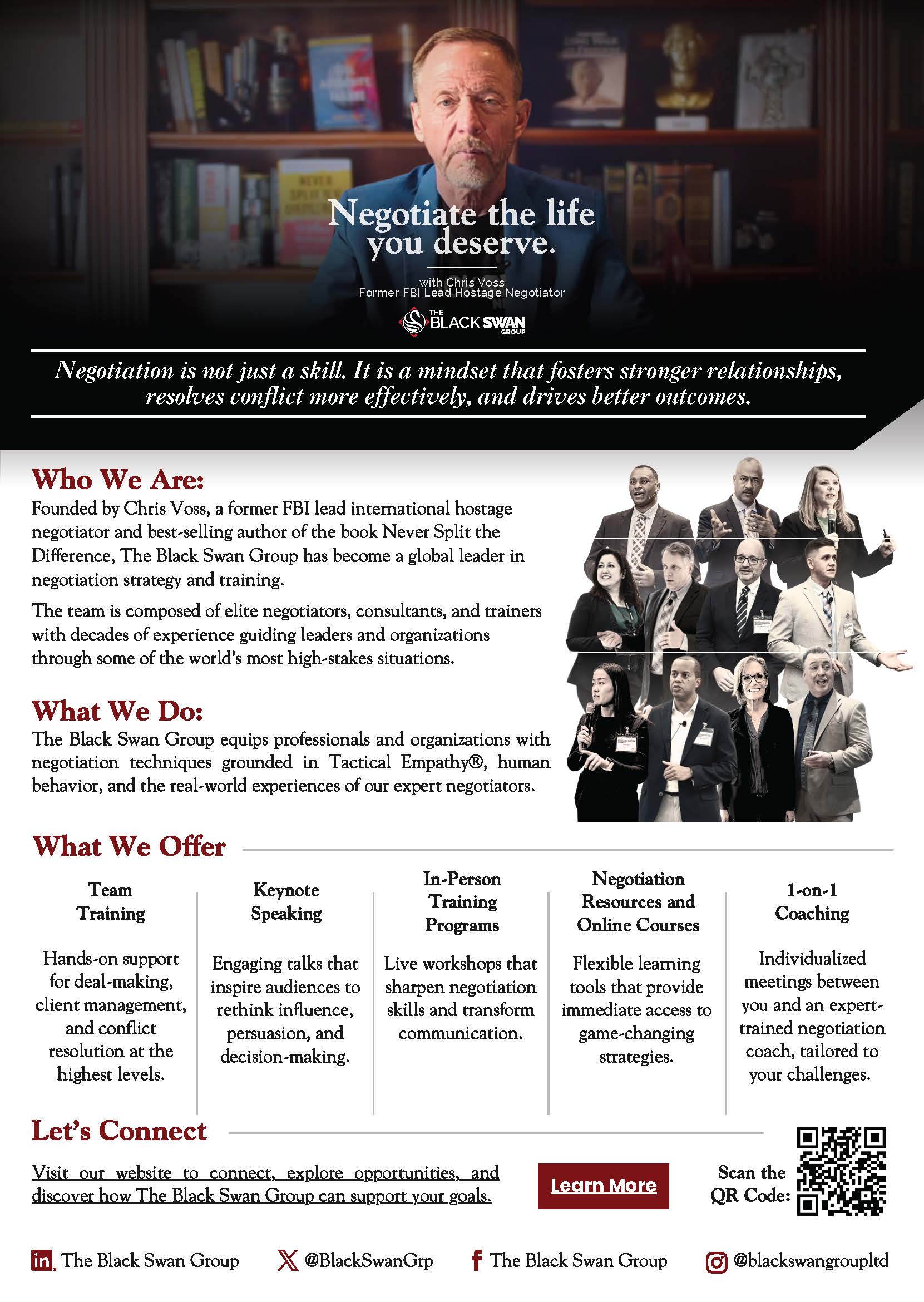 The Black Swan Group equips professionals and organizations with negotiation techniques grounded in Tactical Empathy®, human behavior, and the real-world experiences of our expert negotiators.