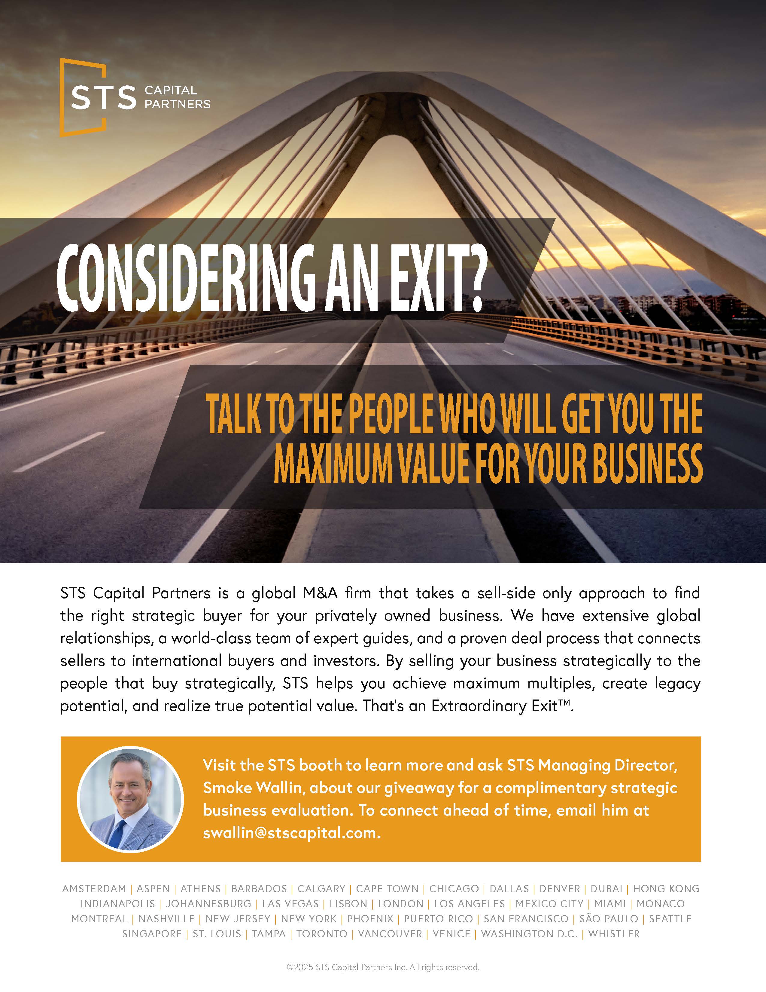 STS Capital Partners is a global sell-side M&A firm like no other. We are expert guides for private, founder, and entrepreneurial business owners on the journey to achieving an Extraordinary Exit™. Our extensive global relationships, world-class team, and proven deal process bring international strategic buyers and investors to the table who deliver maximum financial value. As a result, we help clients fulfill bigger ambitions in life and leave lasting legacies by inspiring charitable donations through our Success to Significance™ program with a goal of raising billions of dollars in new philanthropic and impact capital to support charities like Altruvest, Knowledge Impact Network, and DignityMoves.